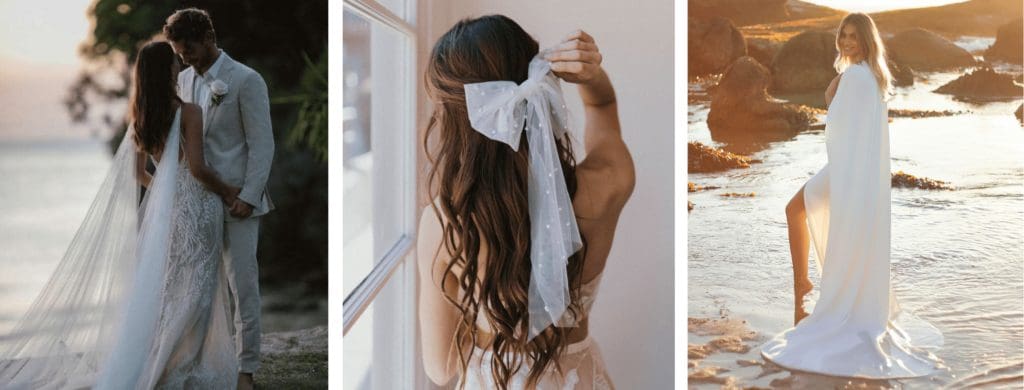 Si l’idée de porter une cape de mariée vous intrigue mais que vous n’êtes pas certaines de vouloir franchir le pas, vous pouvez choisir l’option des ailes de mariée! Il s’agit de deux voiles de tulle fins que vous fixez à chaque épaule, et qui voleront derrière vous à chacun de vos mouvements. C’est l’option parfaite pour ajouter une touche de romance et de féérie à votre tenue!