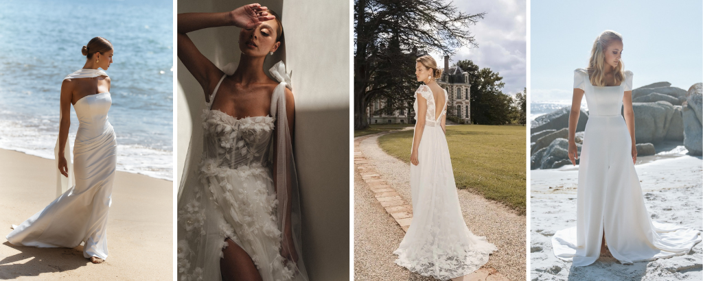 Minimalism, or the art of “quiet luxury”, showcases straight lines and clean cuts, elevated by noble fabrics such as crepe, satin, or mikado. Here, every detail is discreet yet impactful: a perfectly placed slit, an open back, a removable sleeve.